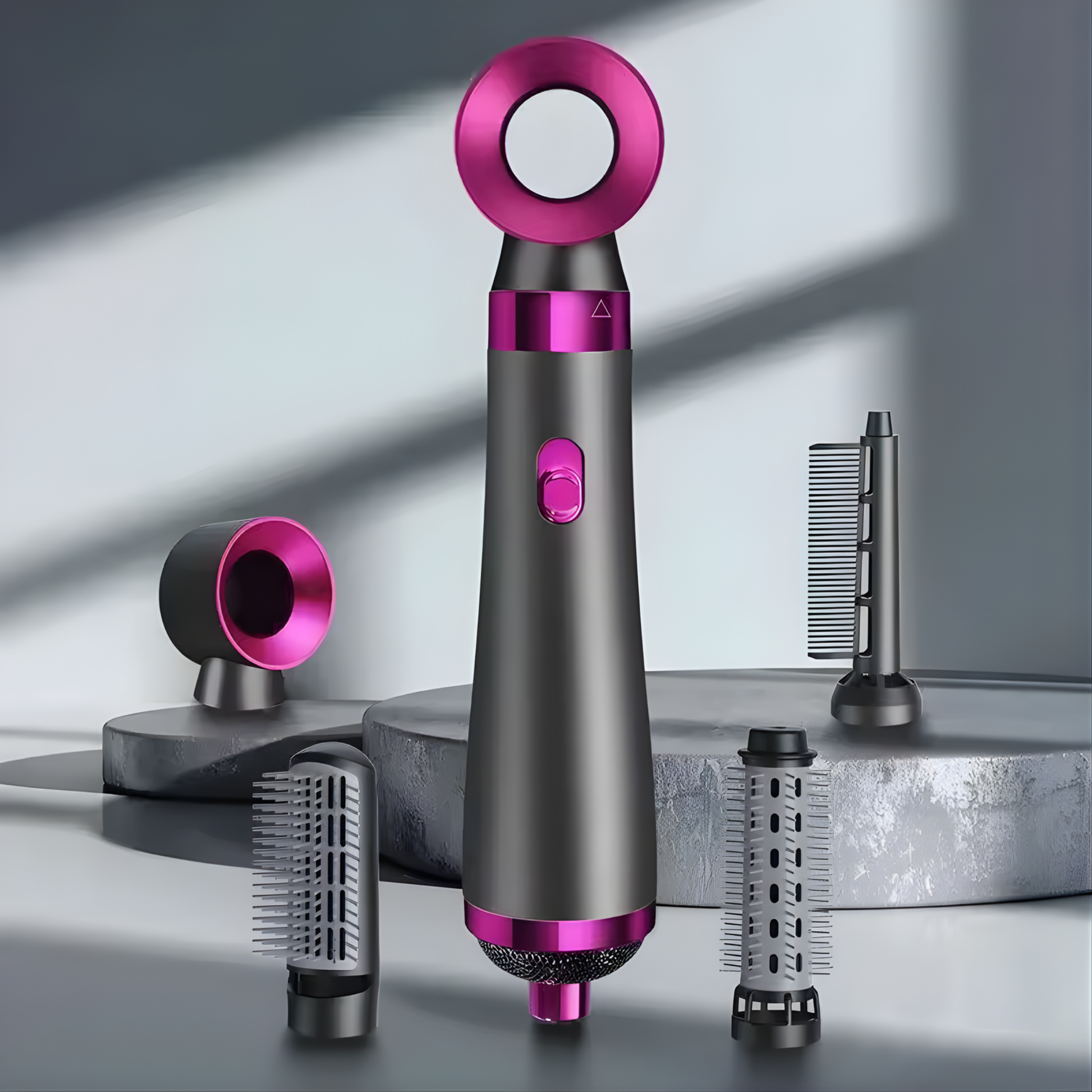 Este cepillo secador 5 en 1 de 1200W ofrece una solución completa para secar, peinar y estilizar el cabello con facilidad. Su diseño multifuncional permite alisar, rizar, dar volumen y moldear diferentes tipos de cabello gracias a sus accesorios intercambiables.