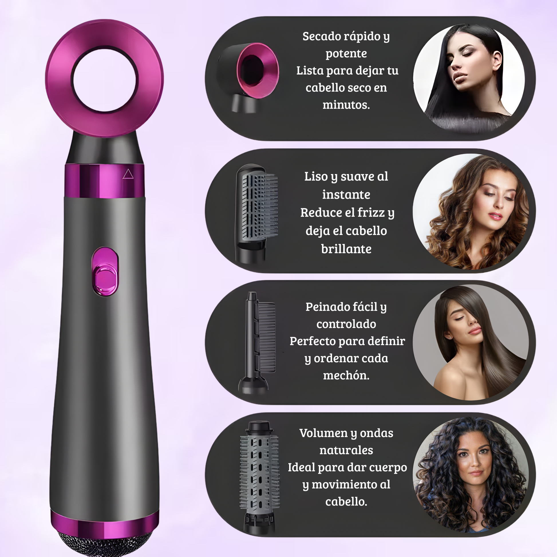 El cepillo secador incluye 5 accesorios intercambiables que permiten alisar, rizar, dar volumen y secar el cabello. Es ideal para crear distintos estilos tanto en cabello corto como largo, todo con un solo dispositivo multifuncional.