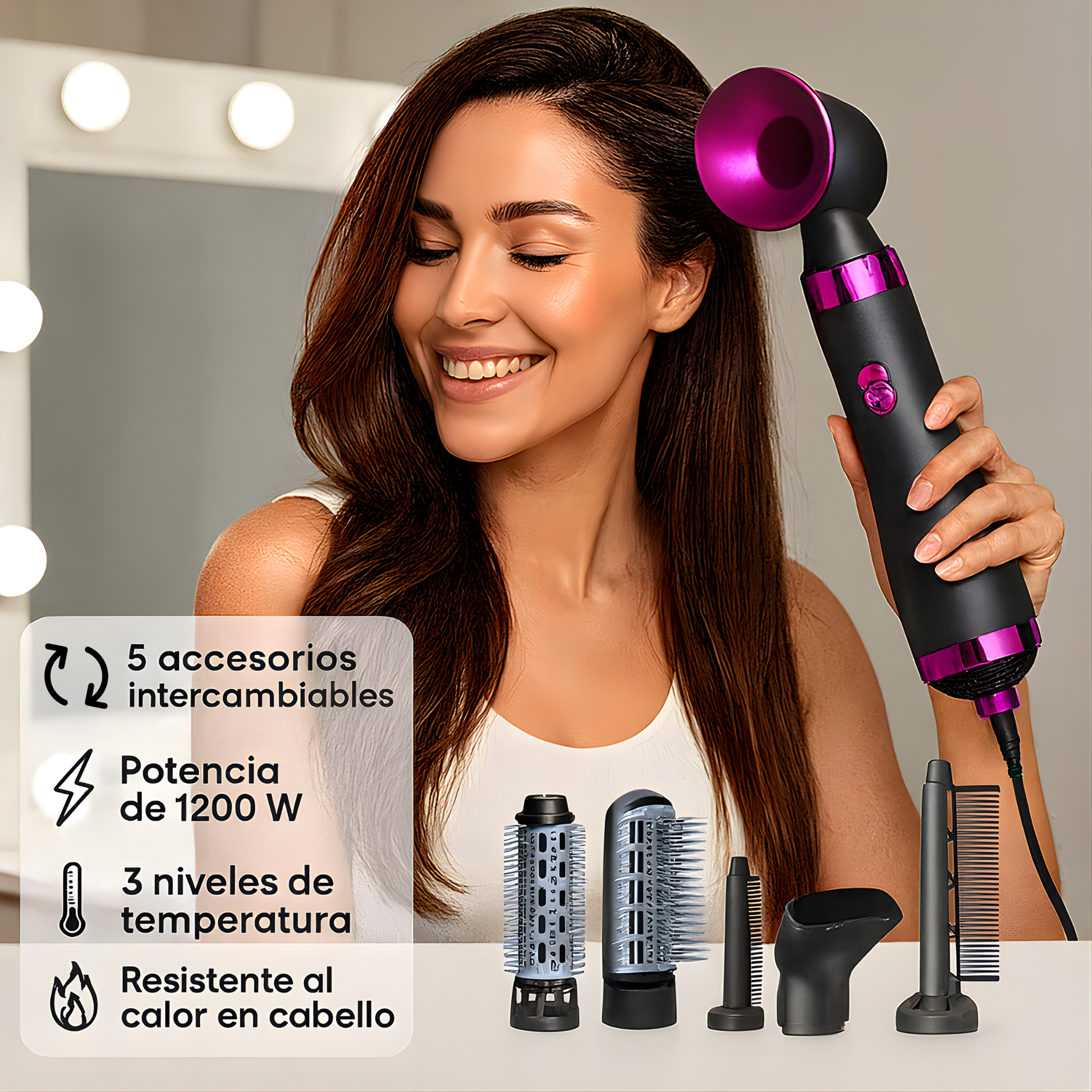 - 5 accesorios intercambiables para crear múltiples estilos: alisado, rizos, ondas y volumen.